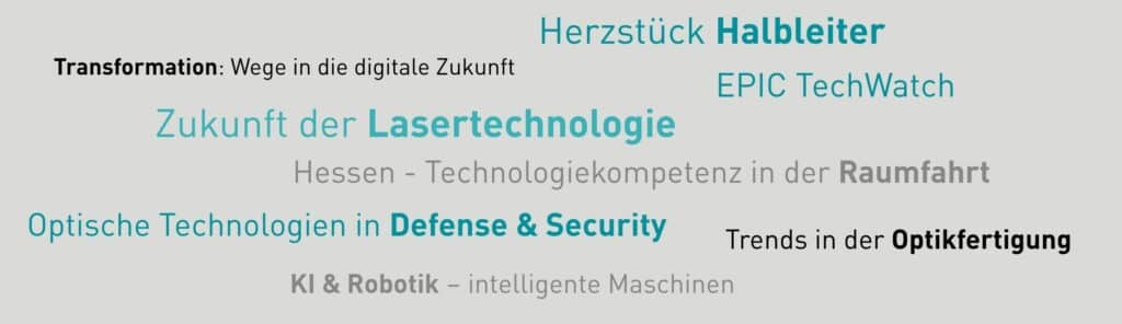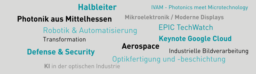 KI | Halbleiter | Laser Development | Industrielle Bildverarbeitung mit KI | Mikrotechnologie | Einkauf mit KI | Start-up Matching | Kollaborative Robotik | TransMit Automotive | MedTech | Defense & Security | EPIC TechWatch | KI im Einkauf | IVAM Photonics meet Microtechnology | LifeScience – Chance für Mittelhessen | Modern Optics Transformation und vieles mehr.